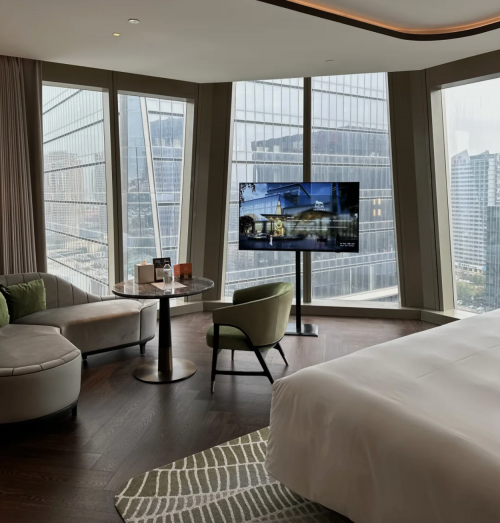 踏入青岛美高梅酒店的那一刻起,一场融合了奢华、舒适与文化底蕴的住宿体验便悄然开启。首先映入眼帘的是酒店大堂,大型曲面屏幕上呈现汇聚科技感与艺术性的山海图,营造出一种既尊贵又不失温馨的氛围,仿佛让人置身于海浪轻拂的梦幻之中。