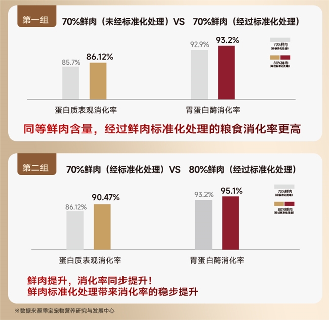 为此弗列加特率先自研“鲜肉标准化处理系统”,在不破坏肉质组织和细胞的前提下去除多余水分,使干粮的鲜肉纯度更高达80%;并通过自主研发的“低温真空鲜肉浓缩工艺”专利,将蛋白先进行“预消化",提高蛋白利用率和消化吸收速率,精准匹配不同场景、不同年龄阶段宠物的营养需求。