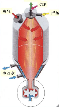 (图片说明:蒸汽浸入式杀菌:产品注入到巨大的真空蒸汽空间中,产品以自然滴落的形式匀速通过,利用蒸汽与产品进行快速热交换完成杀菌,通过均匀的热交换,不仅能有效杀菌,还能保持产品的营养成分和口感:产品的蛋白变性最少:达到了瞬间锁鲜的效果:)