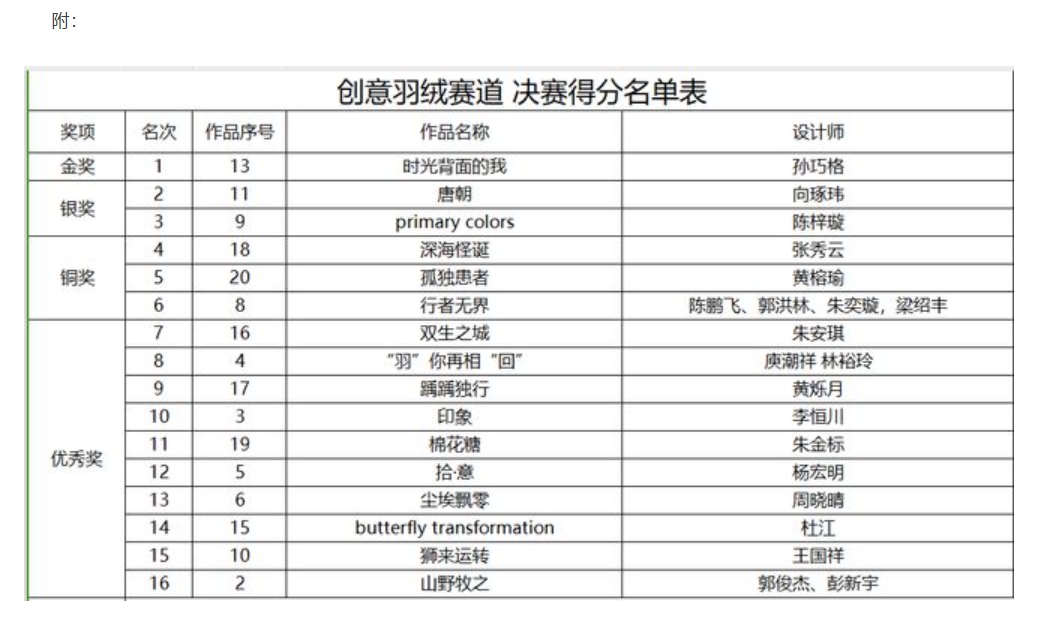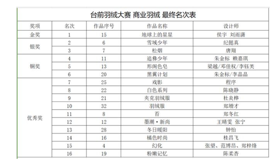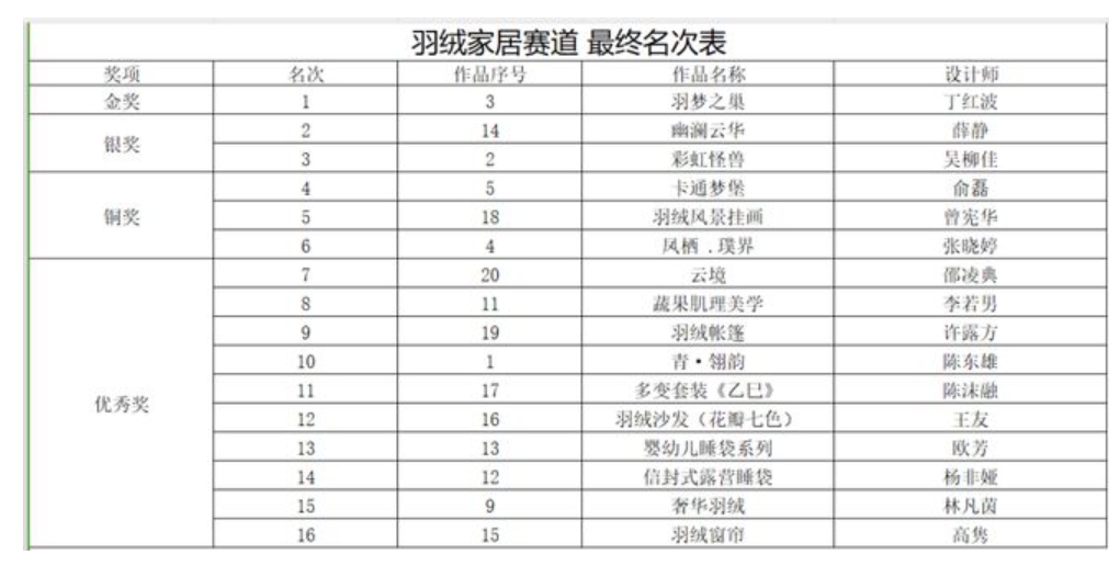 最终,本次大赛创意羽绒赛道、商业羽绒赛道和羽绒家居赛道三项金奖分别被孙巧格、侯宇、刘雨潇和丁红波获得。