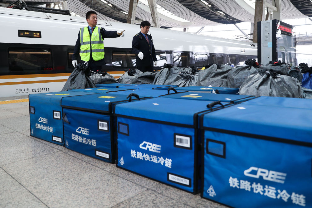 11月11日,工作人员在北京南站清点已卸车的快件。新华社记者郑焕松摄