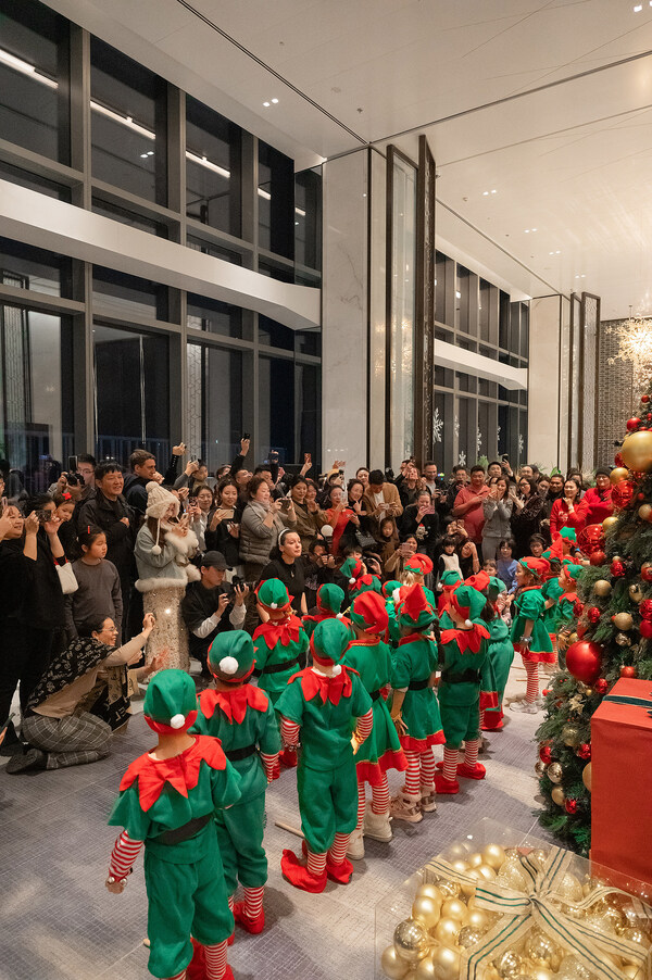 童声在空中大堂的穹顶间回响,纯净的歌声犹如冬日暖阳,祥和、温柔,融化寒冬。随着儿童唱诗班演绎的三首欢快的圣诞歌曲,现场气氛逐渐高涨,优美的旋律让宾客沉浸在浓厚的节日氛围中。6时18分,大家移步至圣诞树旁,共同见证圣诞树的璀璨点亮。当灯光点亮的那一刻,节日的喜悦和温馨充满全场,而圣诞老人的惊喜亮相更为活动增添了许多欢乐。