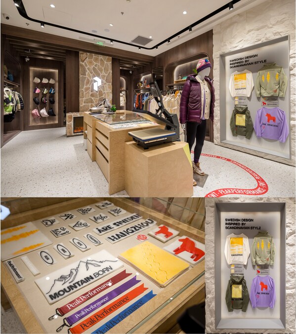 区别于品牌其他门店,作为国内首家IP概念店,融入Peak Performance"Fun&Joy&Togetherhood"的品牌理念,展现IP概念店特有的文化主题。此次图案纹样视觉设计将Peak Performance北欧血脉与杭州本土在地文化相结合,其中包含来自杭州知名文化地标——西湖的断桥、三潭印月,以及来自瑞典代表"爱与幸福"的达拉木马与PP首创的Helium绗缝纹路、体现品牌滑雪基因的高山自由滑雪经典轨迹纹样,将多重意向重塑并施以全新解读。品牌更计划新的一年于店内每季推出限时Workshop,结合北欧与杭州本土文化,合作来自多个领域的艺术家及手工匠人,带来诸多将品牌基因与东方文化底蕴相结合的主题活动,以期与消费者产生更加紧密的联结,切身地与品牌对话,实现品牌精神的探索与延续。