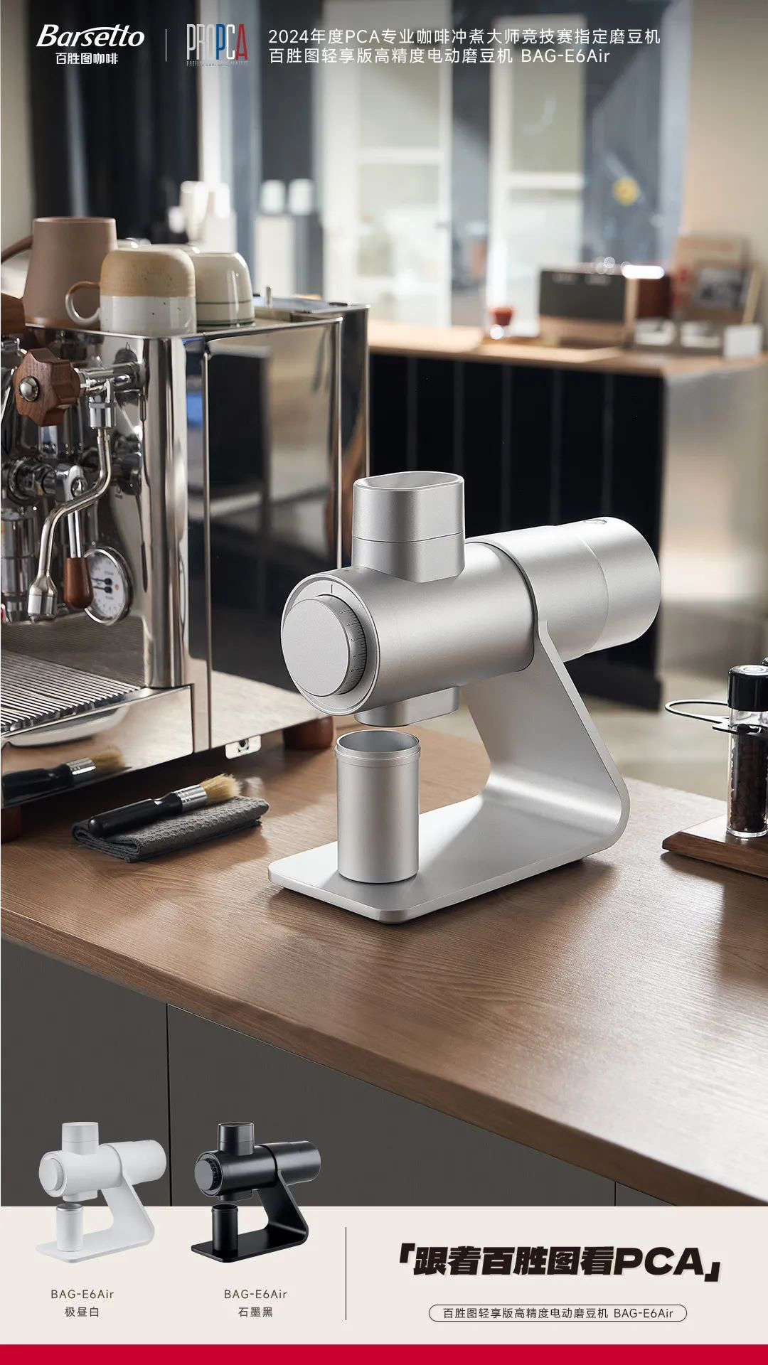作为全球咖啡行业的标杆赛事之一——PCA(专业咖啡大师竞技赛)对参赛者的设备要求极高。百胜图凭借其精准的设备和先进的技术,一直是PCA赛事的重要支持者,2024年双方也选择继续延续专业合作,Barsetto百胜图旗下轻享版高精度电动磨豆机BAG-E6Air成为PCA专业咖啡冲煮大师竞技赛官方指定磨豆机,并以其小巧轻便的设计与出色的研磨精准度,成为参赛选手的重要搭档,帮助他们在赛场上最大限度地发挥出自身水平。