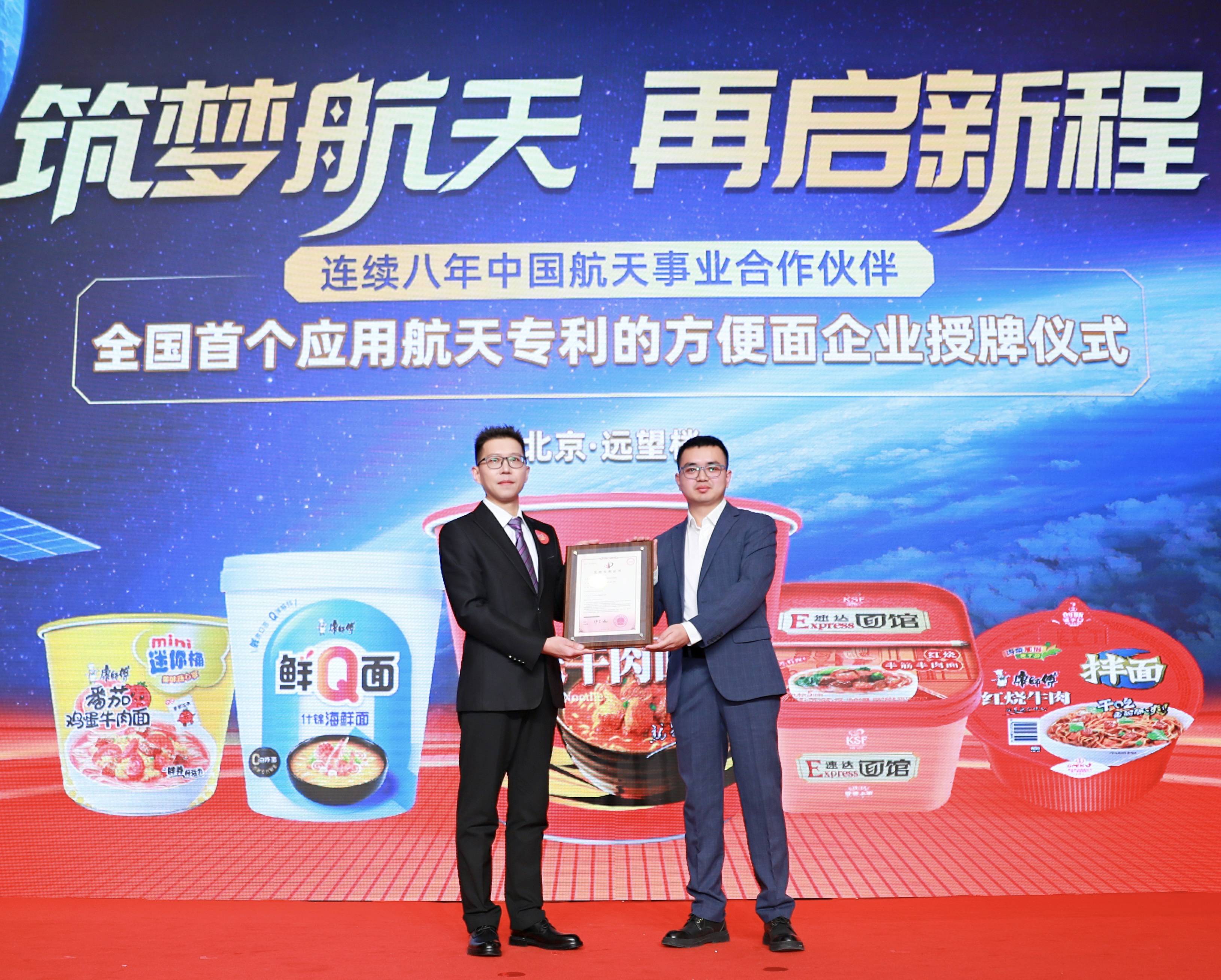 2024年12月27日,中国航天事业合作伙伴康师傅举办了主题为“筑梦航天,再启新程·全国首个应用航天专利的方便面企业授牌仪式”活动,康师傅成为全国首个将航天专利应用于改进方便面生产工艺的企业。