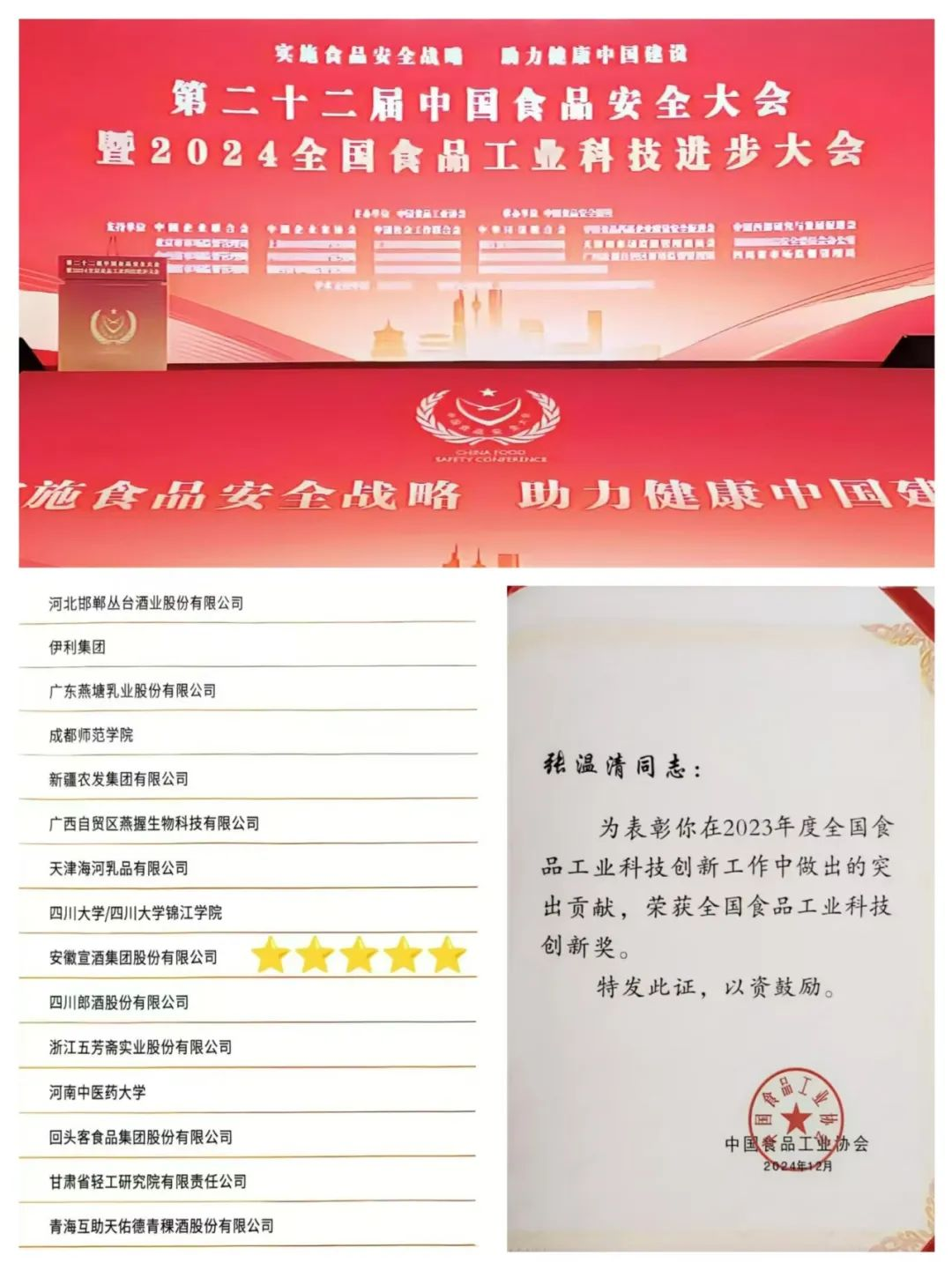 2024年12月16日,第二十二届中国食品安全大会暨2024全国食品工业科技进步大会在北京饭店隆重举行。经专家组严格评审,宣酒集团最终脱颖而出,成为安徽省唯一荣获“2024中国食品工业协会科学技术奖”的白酒企业。同时,宣酒张温清也荣获了安徽省唯一的“中国食品工业协会科技创新奖”个人奖项。