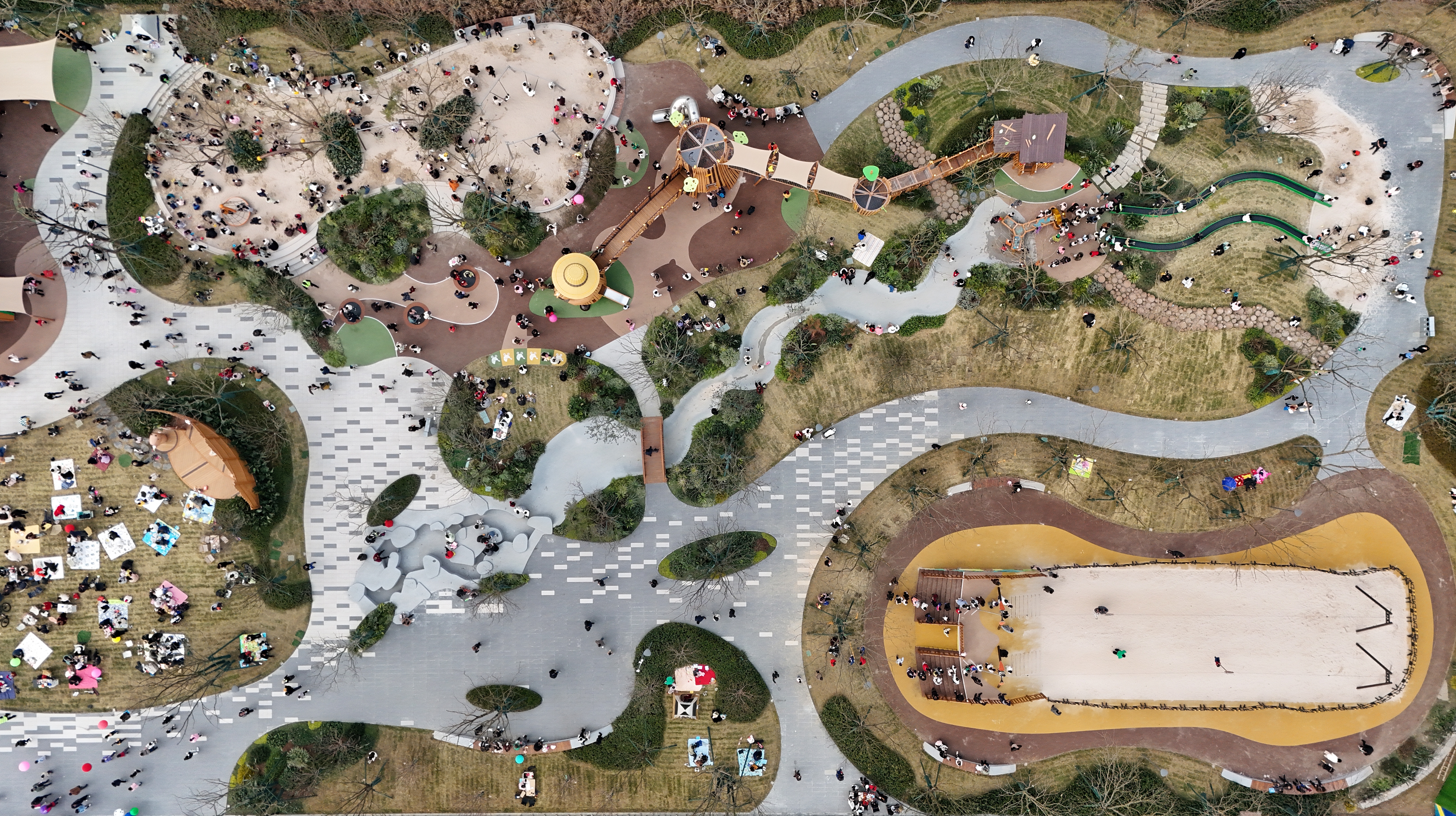 2025年1月5日,人们在位于成都天府新区的卡皮巴拉主题乐园玩耍(无人机照片)。四川成都将时尚潮购、品质生活、川味烟火等消费需求与全域消费资源相匹配,形成多元消费空间组合,推动多样化的消费场景加速创新升级,以满足消费者的需求。(新华社记者刘坤摄)