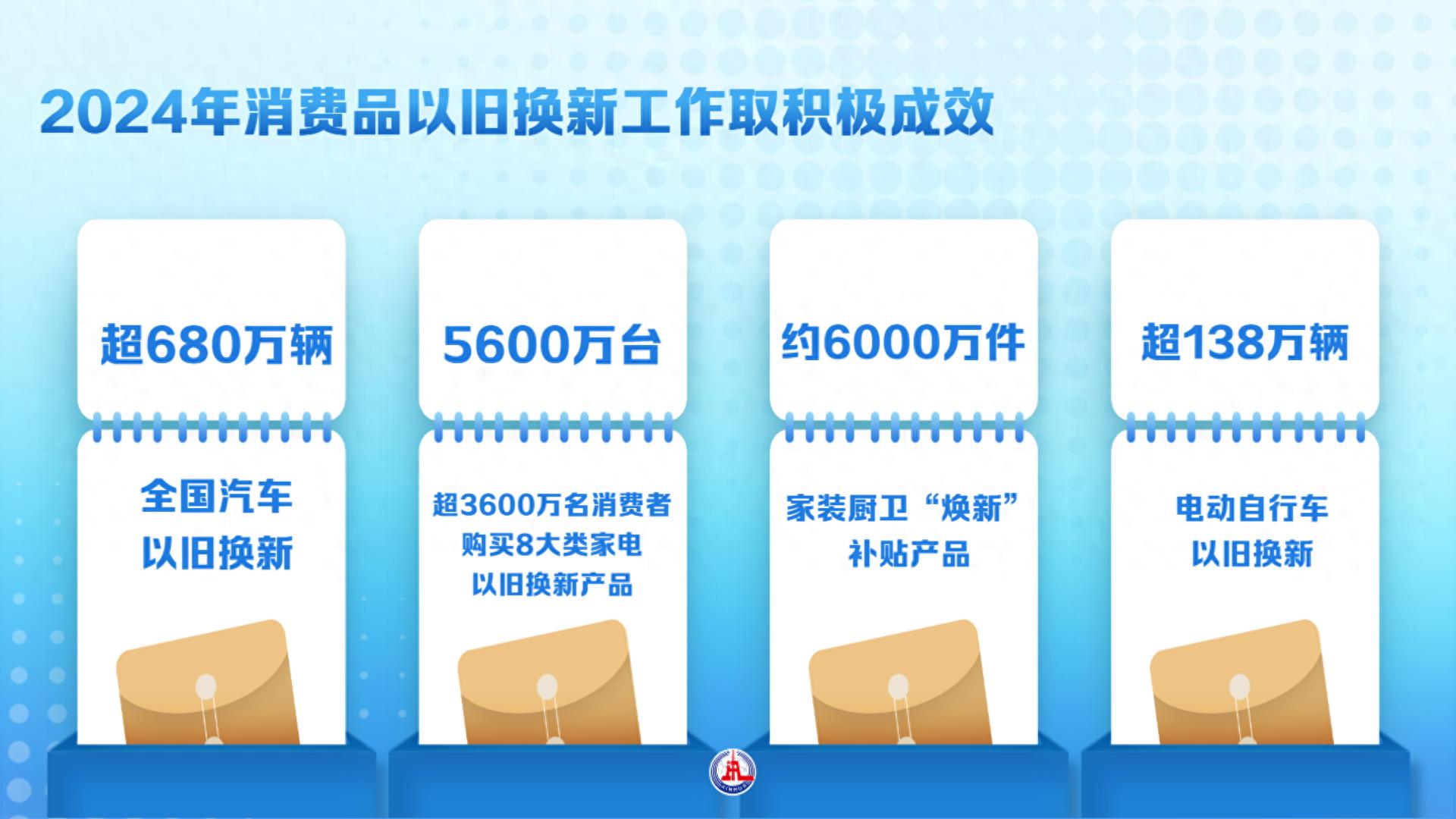 据介绍,2024年1-11月份,社会消费品零售总额44.3万亿元,同比增长3.5%。特别是消费品以旧换新工作取得了积极成效,据初步统计,2024年,全国汽车以旧换新超过了680万辆,超3600万名消费者购买8大类家电以旧换新产品超过5600万台,家装厨卫“焕新”补贴产品约6000万件,电动自行车以旧换新超过138万辆。消费品以旧换新带动相关产品销售额超过1.3万亿元。可以说,以旧换新换出了消费新动能、换出了绿色可循环,更换出了生活好品质。