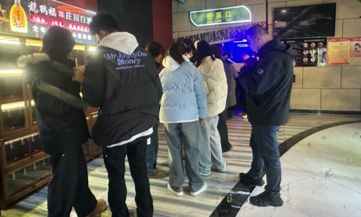 图为某电影院观众正在观影厅检票口排队