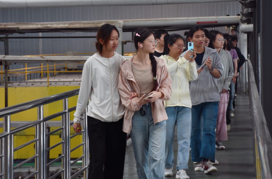 随后,师生们沿着参观走廊,移步至瓶啤车间和发酵罐群的智能化生产车间。码垛、洗瓶、灌装、杀菌等每一个生产环节尽收眼底。从传统制造流程到高智能化、自动化的生产体系,处处彰显着时代发展的印记。学生们深刻体会到金星啤酒对品质的严格把控,也对酿酒工业的生产过程有了更直观的认识。