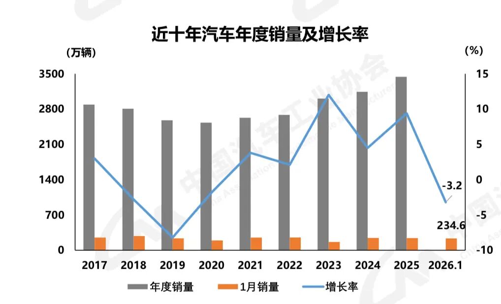 中汽协数据显示,1月,中国汽车产销分别完成245万辆和234.6万辆,环比分别下降25.7%和28.3%,产量同比增长0.01%、销量同比下降3.2%。