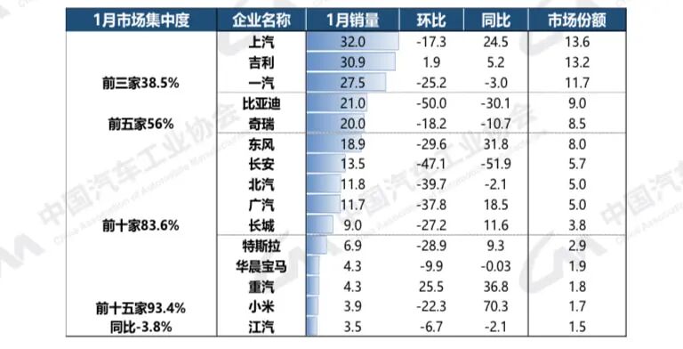 1月汽车销量排名前十五位的车企集团单位:万辆、%