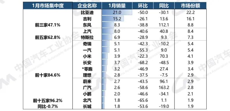 1月新能源汽车销量排名前十五位的车企集团单位:万辆、%