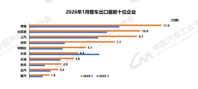 中汽协数据还显示,1月,整车出口前十企业中,奇瑞出口量达11.9万辆,同比增长47.2%,占总出口量的17.4%。与2025年同期相比,吉利出口增速最为显著,出口达7.7万辆,同比增长超过140%。