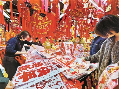 | 2月9日,北京百荣世贸商城二期五层“年货一条街”一片红火。春联、福字、马年生肖挂饰等节庆小商品迎来销售高峰 |