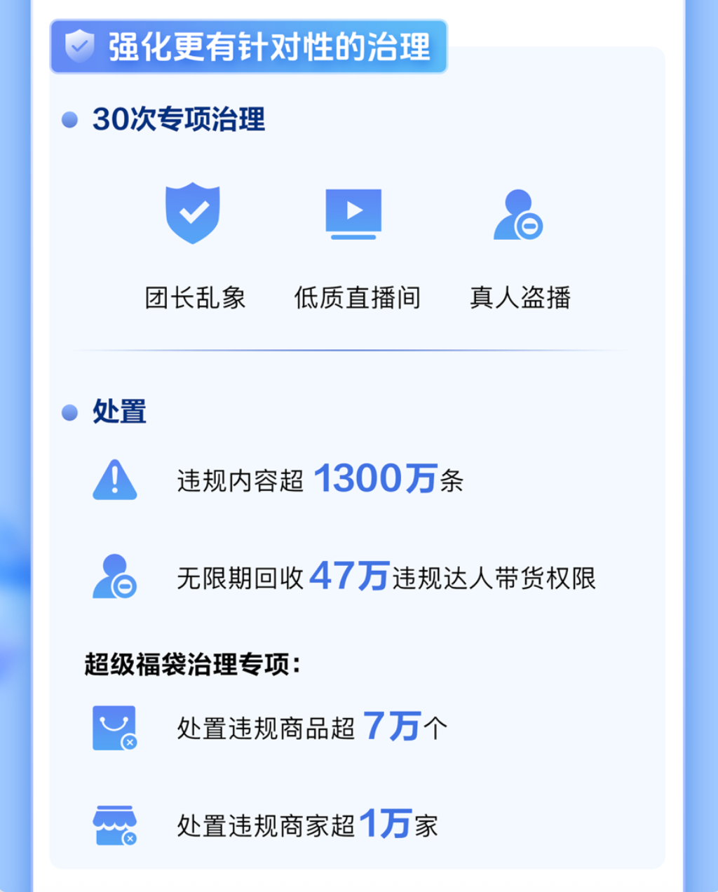 围绕功效夸大,处置商家4.3万个、达人14万名;围绕材质虚假,已累计处置商家4228个、达人16.9万名,珠宝、羽绒服、羊绒羊毛是重点盯防对象;针对售后承诺不实,已有超16万达人被冻结佣金,30万件违规商品下架。