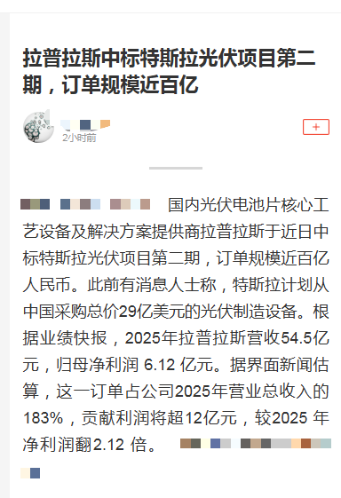 午间,拉普拉斯发布澄清公告,近日,公司关注到有媒体发布了关于公司“拉普拉斯中标特斯拉光伏项目第二期,订单规模近百亿”的报道。经核查,截至目前,公司并未取得相关订单,公司不存在应披露未披露重大信息,后续若触及信息披露标准,将严格按照相关法律法规的规定履行信息披露义务。
