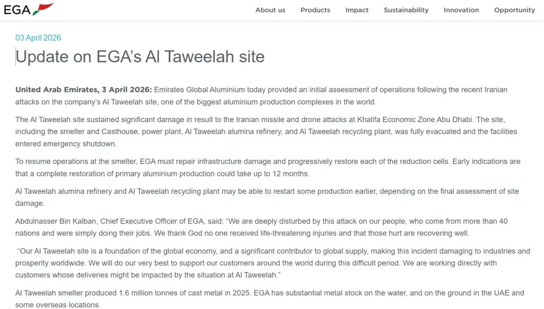 4月3日,阿联酋环球铝业(EGA)发布公告,就旗下塔维拉铝业厂区(AlTaweelah)遭伊朗袭击事件,披露初步运营评估结果。目前,该厂区内电解铝厂、氧化铝精炼厂及再生铝厂已全部停产,其中电解铝产能全面恢复,最长或需1年时间。