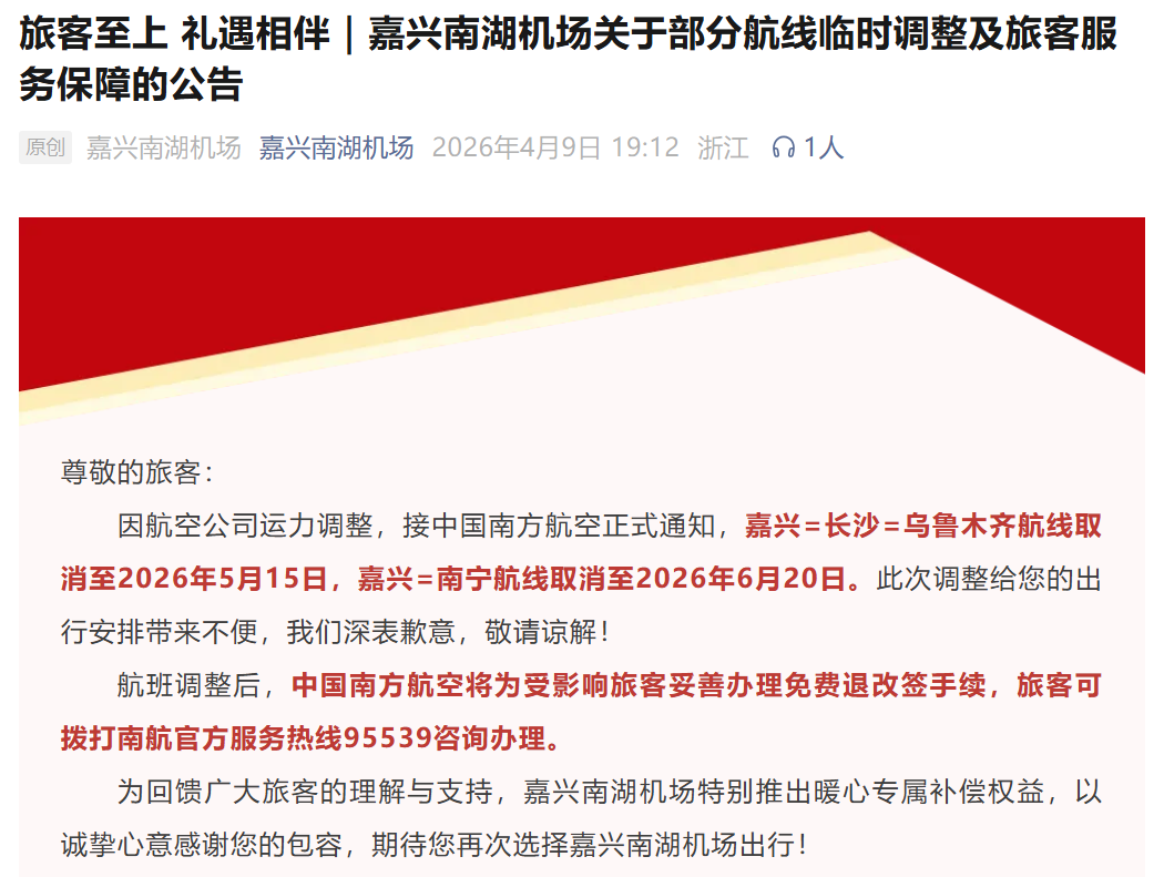 嘉兴南湖机场官方日前发布公告披露:因航空公司运力调整,接中国南方航空正式通知,嘉兴=长沙=乌鲁木齐航线取消至2026年5月15日,嘉兴=南宁航线取消至2026年6月20日。航空公司将为受影响的旅客办理免费退改签手续。