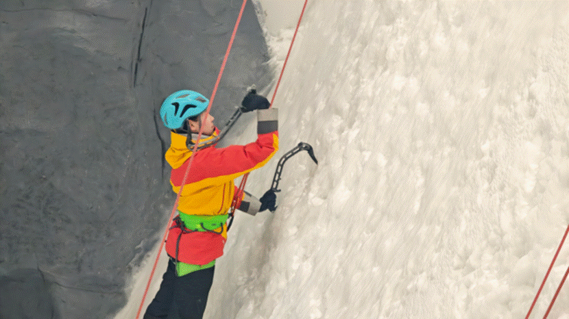 在ICEPANDA室内攀冰馆,眼前是一座12.5米高的专业冰壁,冰面上清晰可见攀爬用的冰镐与冰爪印痕。几名身着专业装备的攀冰爱好者正在不同难度线路上交替上行,冰屑飞溅,引来阵阵喝彩。