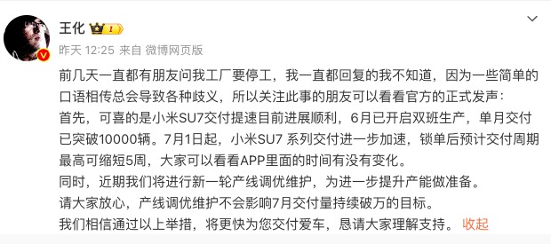 小米汽车工厂“停工”?官方回应:系产线调优维护 ,不会影响7月交付目标