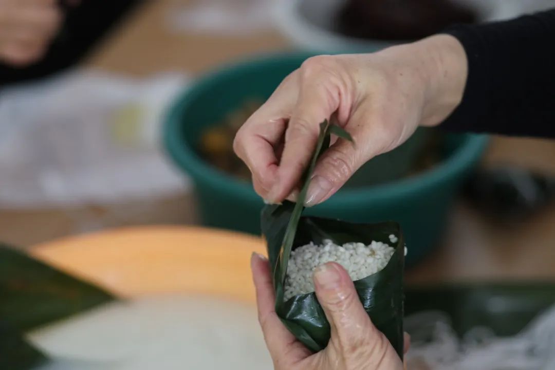 活动在热闹的气氛中开始,有包粽子经验的职工指导新手包粽子的技巧,将粽叶挽成漏斗状,填上糯米、馅料,再封口捆扎,巧手翻飞,将节日的祝福包裹进一个个饱满可爱的粽子里