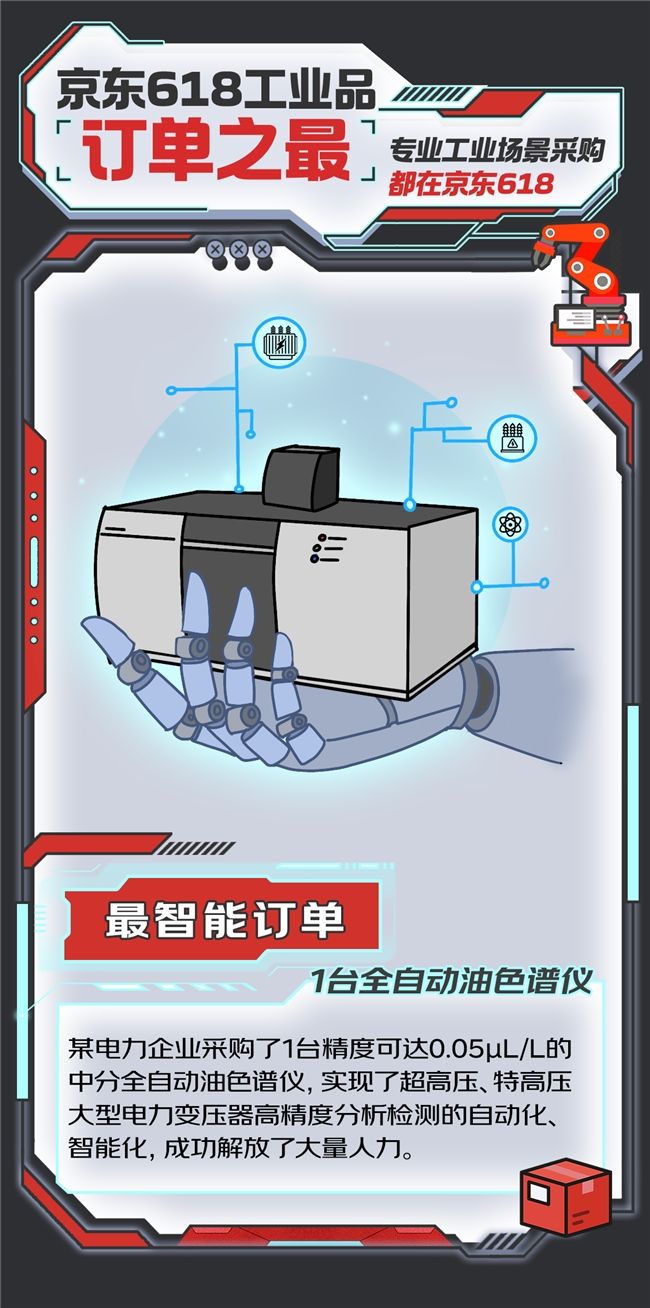 自动检测精度可达0.05μL/L的全自动油色谱仪、功率可达3.2MVA的箱式变电站、铺开可覆盖11个足球场的防尘网、垒起来接近5个埃菲尔铁塔高的木质托盘……这些订单也赋予了京东618更浓的实体产业底色