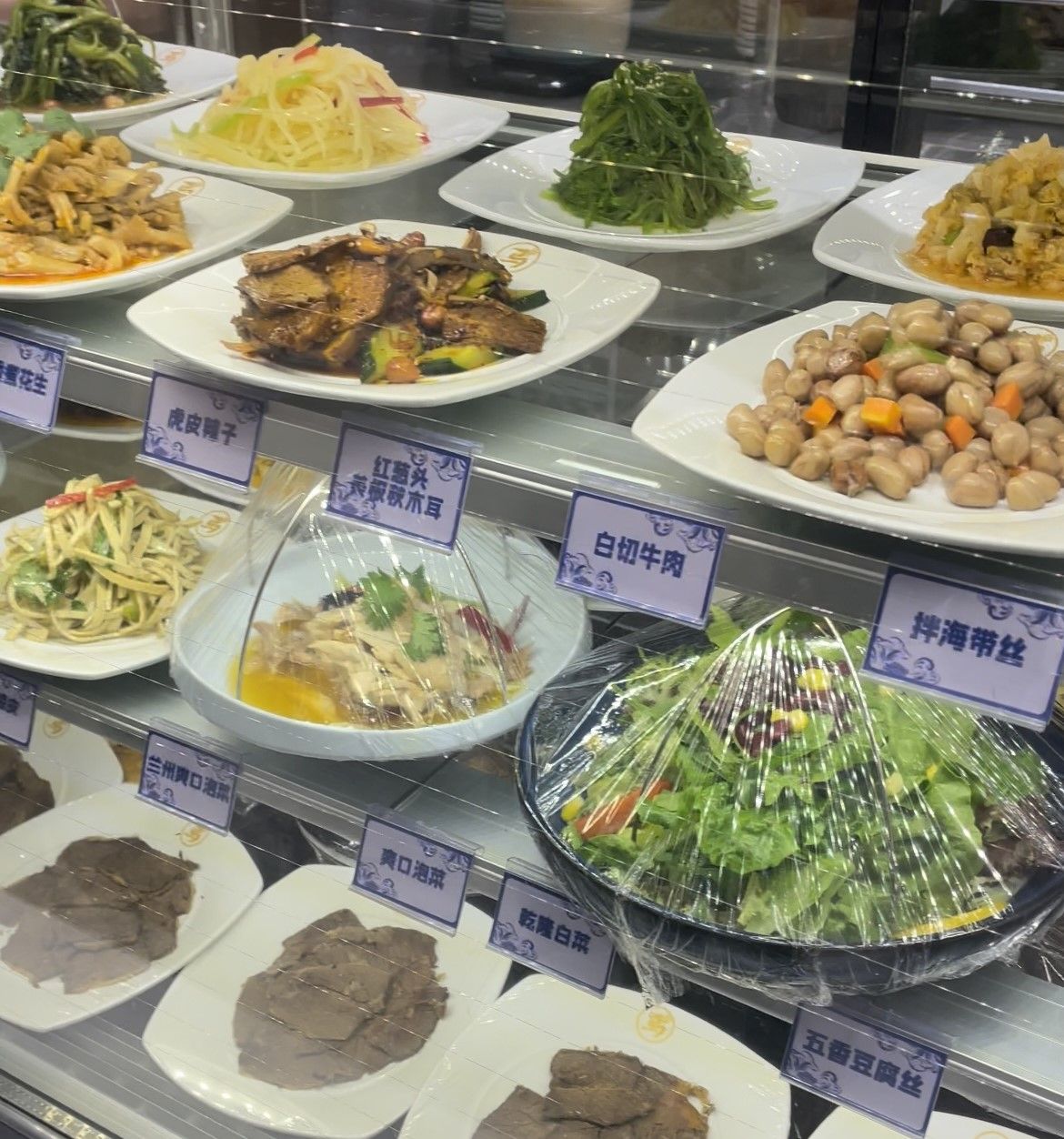 4月2日,记者来到西部马华牛肉面(新街口店),看到收银柜台旁的玻璃橱窗内摆放着各式各样的凉菜,每盘凉菜周围均未标明价格