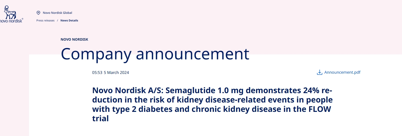 “减肥神药”生产商诺和诺德宣布,在一项后期试验中,其被广泛使用的司美格鲁肽(semaglutide)在治疗肾病方面取得积极进展,可将肾脏疾病相关风险降低24%。
