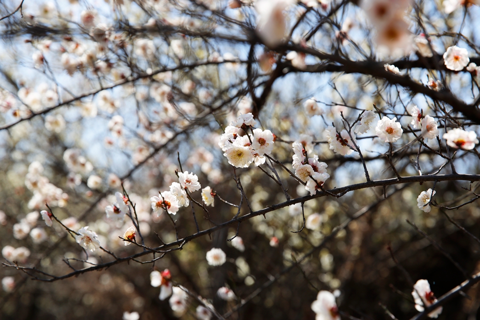 3月18日,游客在河南省济源市承留镇花石村梅园骑行、赏花游玩。