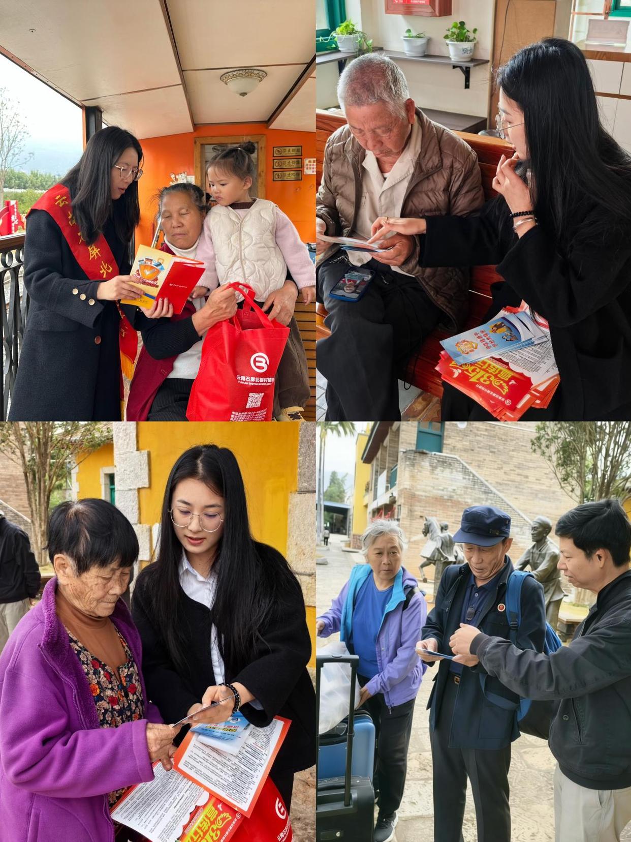 除了定点宣传,石屏金融监管支局工作人员还与北银村镇银行员工一起,组建“金融轻骑兵”,深入站前广场、周边商铺,开展“一对一”答疑。针对老年群体,重点讲解养老领域防骗知识;面向年轻旅客则普及理性借贷,让“守护安心消费”的理念在互动中更加深入人心。