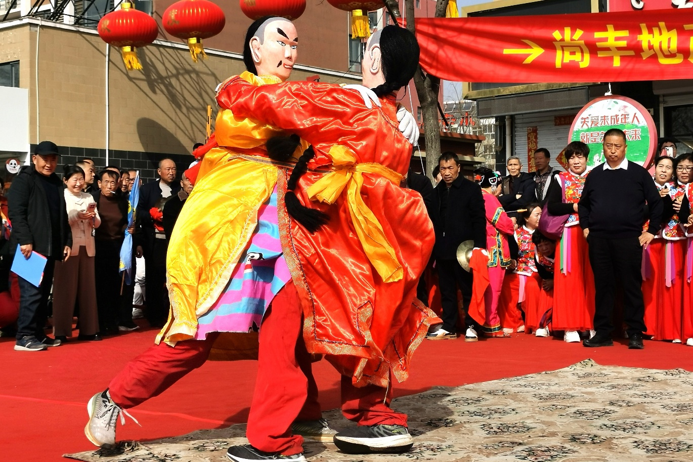 彩旗飞扬,锣鼓震天,舞狮、舞龙、吹歌、高跷轮番登场,精彩不断;彩妆粉腮的表演者与观众引逗互动,叫好声、欢笑声不绝于耳。马年正月,河北保定市徐水区安肃镇小寺各庄村前广场人流如潮、喜庆热闹。