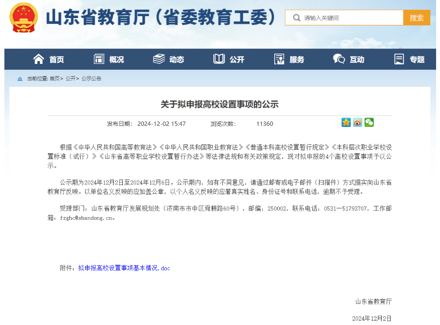 12月2日,山东省教育厅官方网站发布消息,对拟申报的4个高校设置事项予以公示。