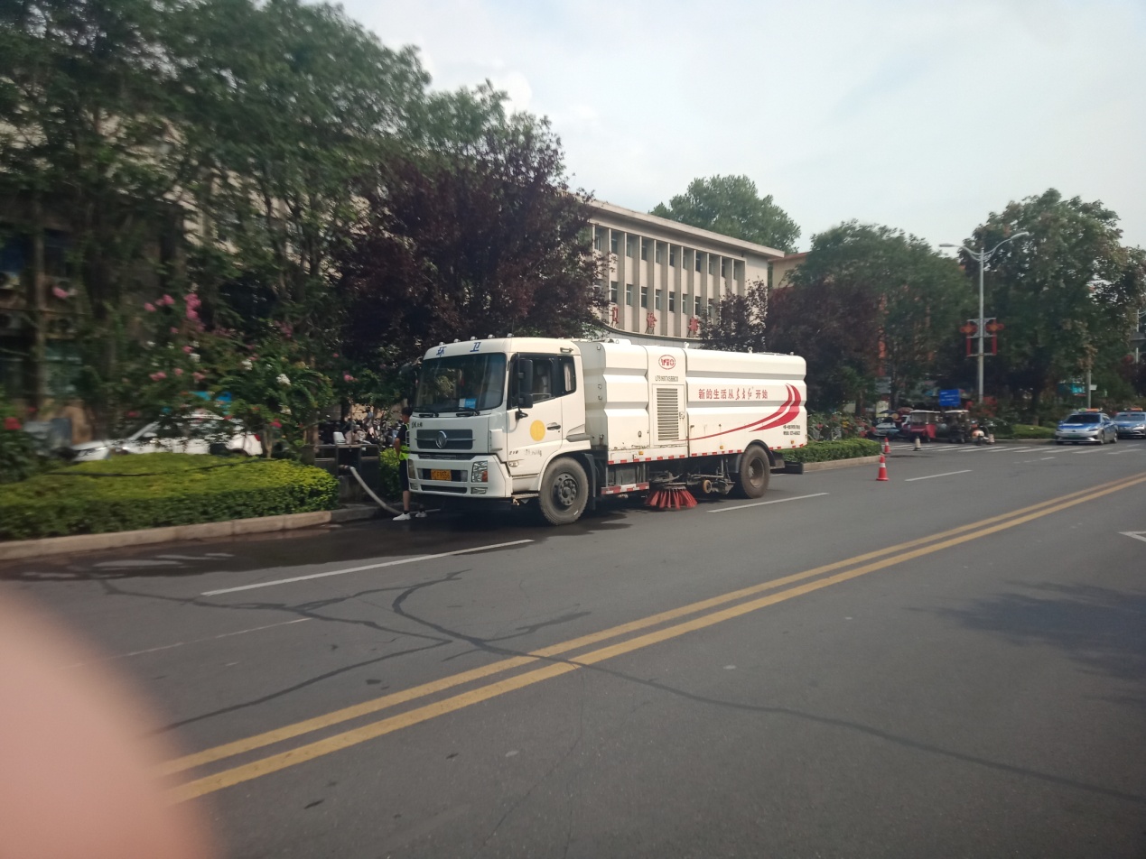 现场目睹承担洛阳环城路日常保洁工作的中国一拖福赛特公司的洗扫车、洒水车、高压冲洗车等各类环卫车辆,分工明确,紧密配合,有序地展开道路清洗作业