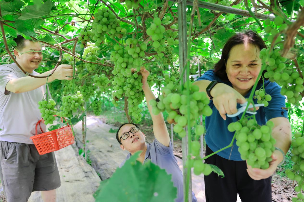 2025年8月9日,游客在广西壮族自治区梧州市万秀区城东镇河口村生态葡萄种植基地自助采摘葡萄,体验立秋时节采摘水果的快乐。