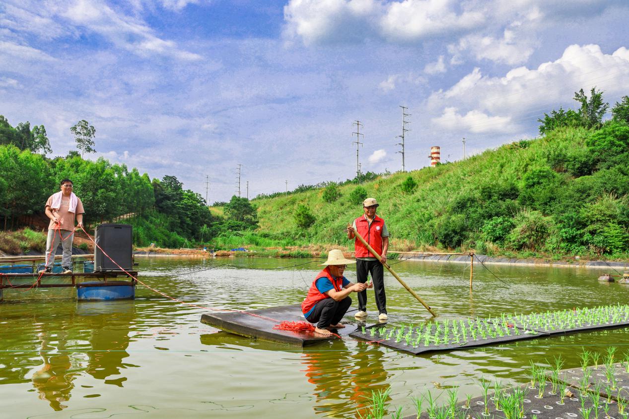 近日,广西科技特派员吴建坤、严正东深入到梧州市藤县藤州镇潭东村洪峰水库生态养鱼基地指导养殖户并现场示范,探索运用水下养鱼、水上种菜的“鱼菜共生”生态种植养殖模式,降低种养成本,生产生态农产品,助农增收。