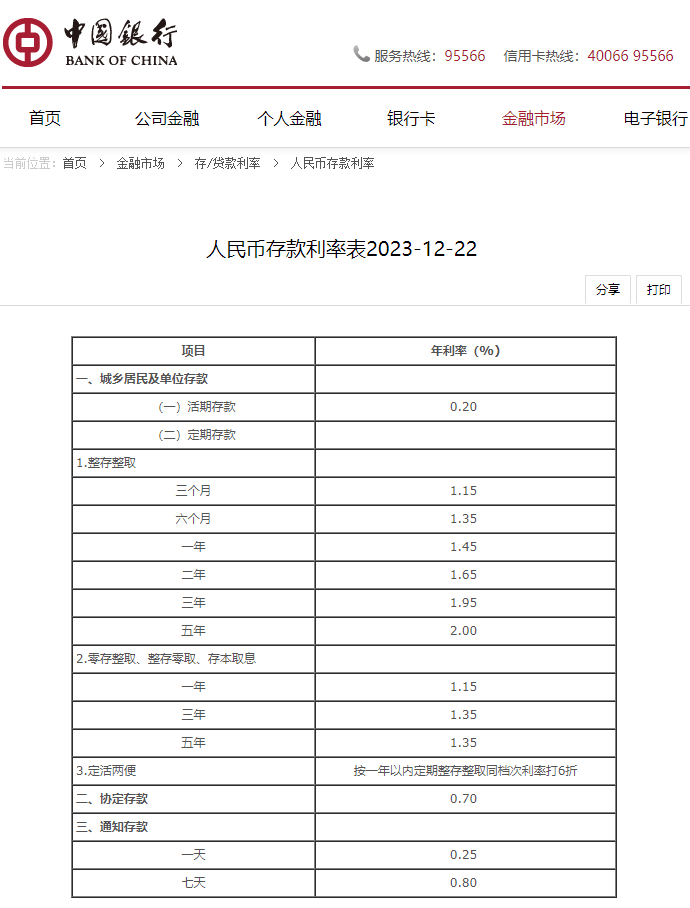 中国银行官网显示,该行于12月22日下调人民币存款利率。其中,定期整存整取三个月、六个月和一年期利率均下调10个基点,一年期利率降至1.45%;二年期下调20个基点至1.65%;三年期和五年期均下调25个基点,分别至1.95%和2.00%。