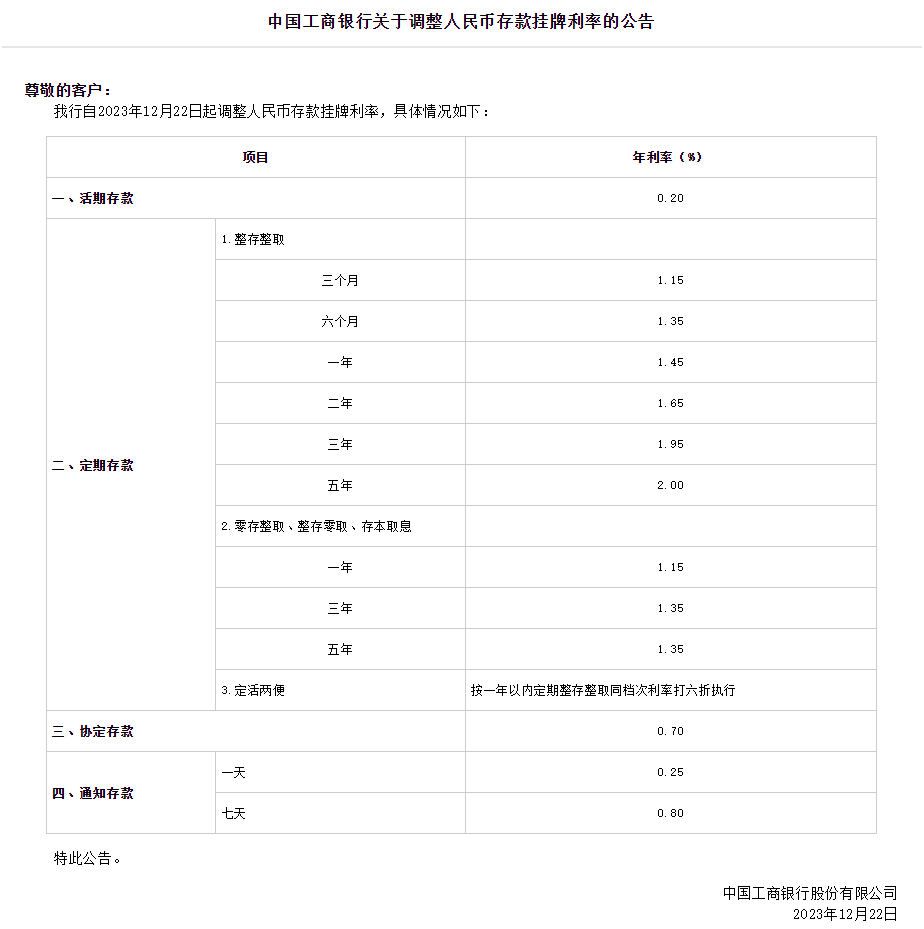 工商银行官网显示,自12月22日起调整人民币存款挂牌利率。其中,定期整存整取三个月、六个月和一年期利率均下调10个基点,一年期利率降至1.45%;二年期下调20个基点至1.65%;三年期和五年期均下调25个基点,分别至1.95%和2.00%。定期零存整取、整存零取、存本取息利率下调10个基点,通知存款挂牌利率下调20个基点。
