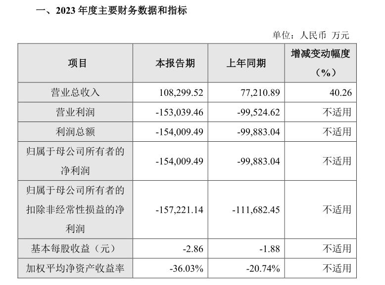 2月24日,荣昌生物披露2023年度业绩快报,公司实现营业收入10.83亿元,较2022年同比增加40.26%;归属于母公司所有者的的净利润亏损15.40亿元,归属于母公司所有者的扣除非经常性损益的净利润亏损15.72亿元,亏损规模较2022年同期均进一步扩大。