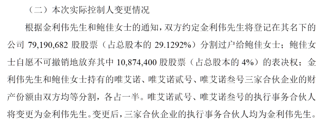 离婚后,金利伟将登记在其名下的公司约7900万股股票(占总股本的29.1292%)分割过户给鲍佳。双方共同持有的唯艾诺、唯艾诺贰号、唯艾诺叁号三家合伙企业,其财产份额由双方均等分割,各占一半。鲍佳自愿不可撤销地放弃占公司总股本4%股份的表决权。
