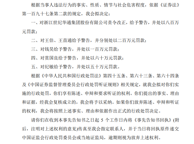 中国证监会拟决定:对世纪华通责令改正,给予警告,并罚款800万元;对公司董事长王佶、公司时任董事长王苗通以及时任财务总监等相关责任人给予警告,并罚款。合计罚款金额达1410万元。