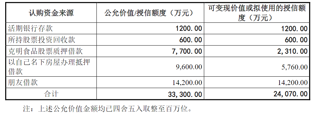 对于此次发行的认购资金来源,克明食品董事长陈宏根据其现有资产状况及预计可使用的授信情况,按公允价值/授信额度看,分别有活期银行存款1200万元、所持股票投资回收款600万元、克明食品股票质押借款7700万元、以自己名下房屋办理抵押借款9600万元和朋友借款1.42亿元。