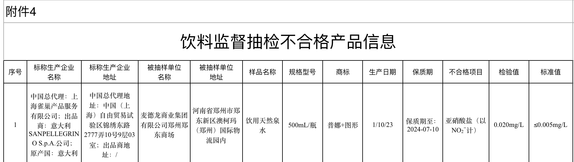 其中,河南省麦德龙商业集团有限公司郑州郑东商场销售的、标称上海雀巢产品服务有限公司中国总代理的、意大利sanpellegrino s.p.a.公司出品的普娜饮用天然泉水(500ml/瓶),其中亚硝酸盐(以no₂-计)检验值不符合食品安全国家标准规定。