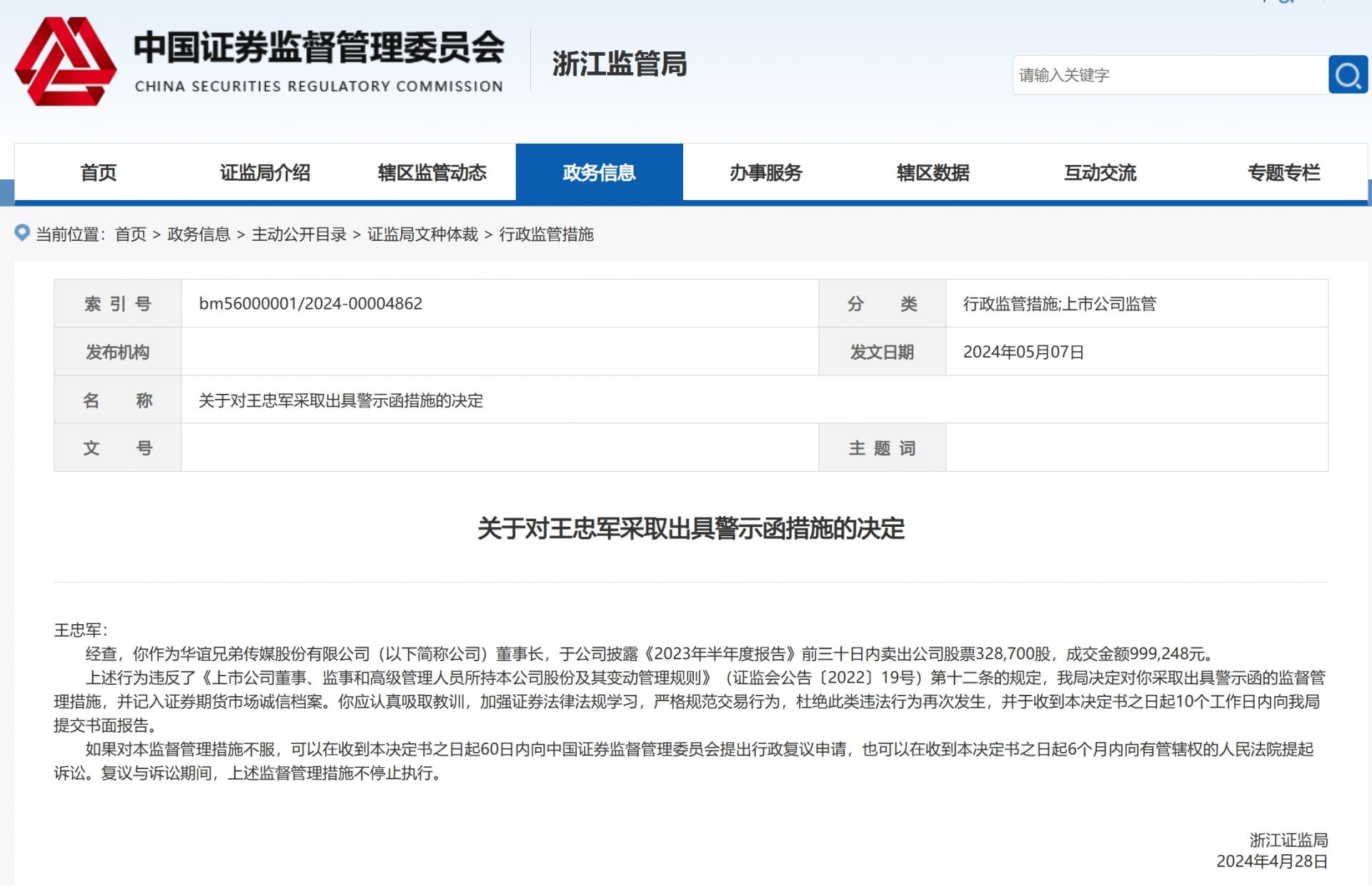 警示函显示,经查,王忠军作为华谊兄弟传媒股份有限公司董事长,于公司披露《2023年半年度报告》前三十日内卖出公司股票328700股,成交金额999248元。上述行为违反了《上市公司董事、监事和高级管理人员所持本公司股份及其变动管理规则》(证监会公告〔2022〕19号)第十二条的规定,浙江证监局决定对王忠军采取出具警示函的监督管理措施,并记入证券期货市场诚信档案。