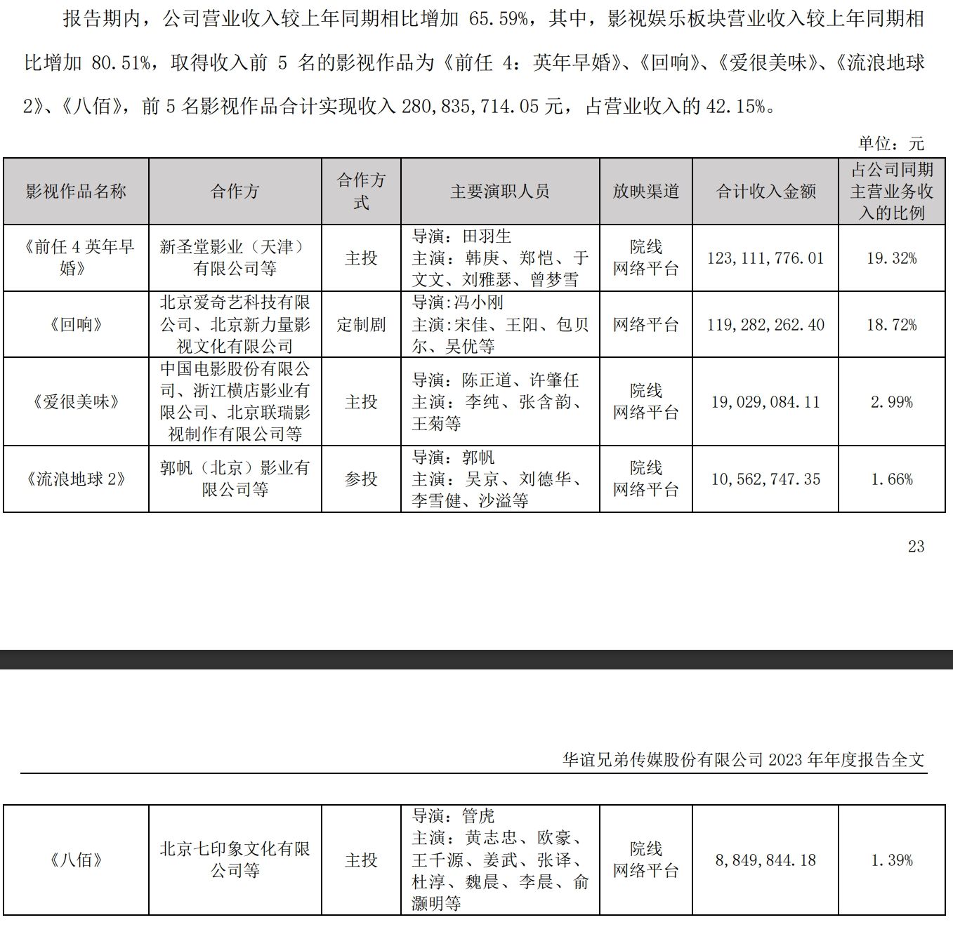 今年4月30日,华谊兄弟公布的年度业绩报告显示,公司2023年营业收入约6.66亿元,同比增加65.59%;归属于上市公司股东的净利润亏损约5.39亿元;基本每股收益亏损0.19元。