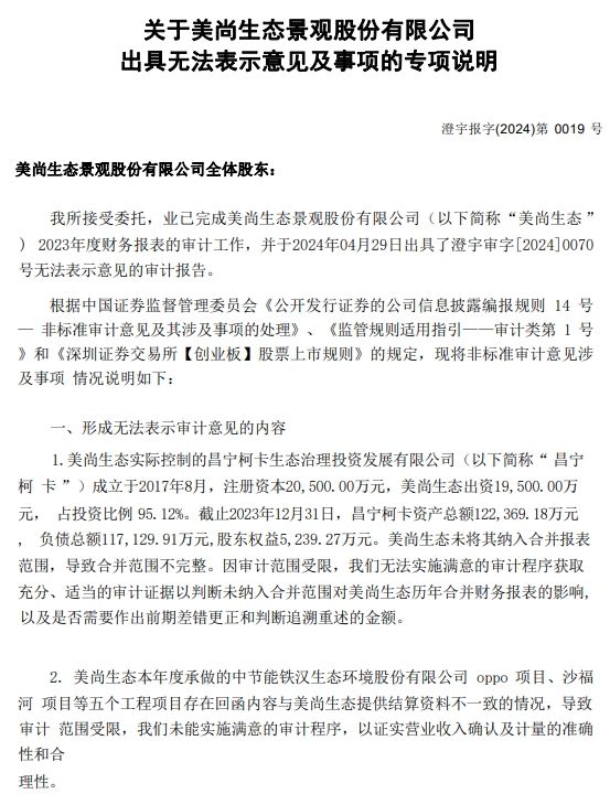 这份专项说明称,美尚生态未将其实际控制的昌宁柯卡公司纳入合并报表范围,导致合并范围不完整。此外,美尚生态承做的五个工程项目存在回函内容与美尚生态提供结算资料不一致的情况,导致审计范围受限。