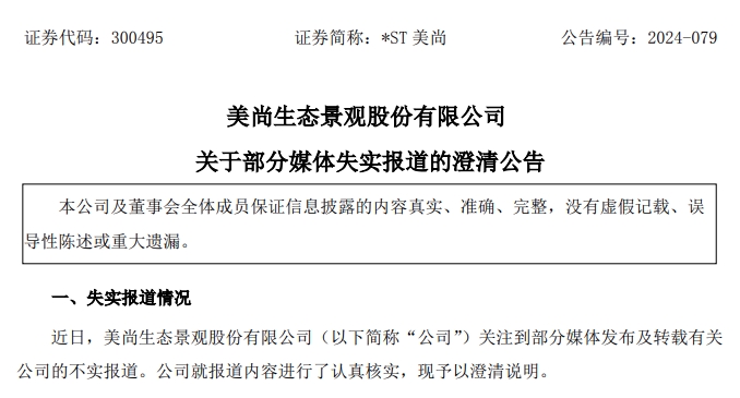 被称为“编织教科书式造假”“造假上市”的*ST美尚(即美尚生态)近日针对“部分媒体失实报道”发布澄清公告称,“相关媒体的报道严重与事实不符”,相关报道“存在故意误导的嫌疑,严重侵犯了公司的声誉”。这份澄清公告并未指明哪些报道失实。
