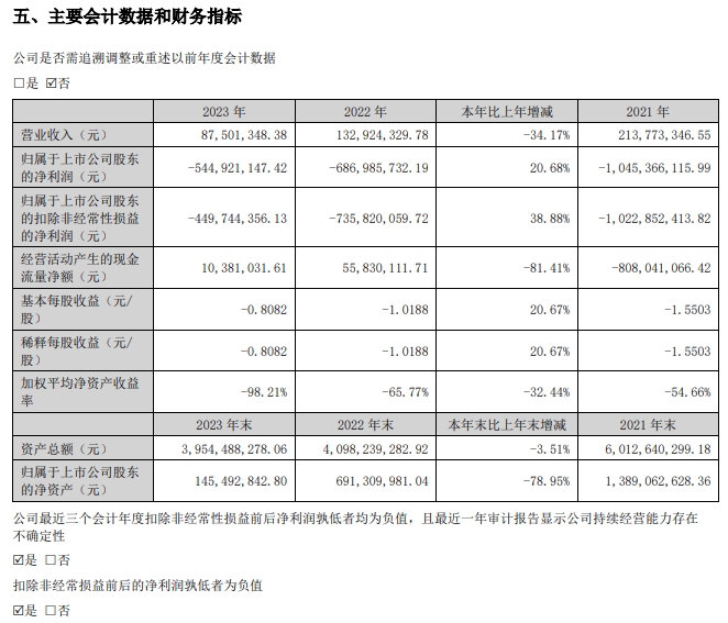 美尚生态4月底公布的2023年年度报告显示,公司被申请破产重整后,市场开拓放缓,营业收入规模急剧下降,但期间费用存在大量固定开支,持续经营能力较弱。2023年公司实现营业收入8750.13万元,较上年同期减34.17%;实现归属于母公司净利润-54492.11万元;实现归属于母公司扣除非经常性损益的净利润-44,974.44万元。