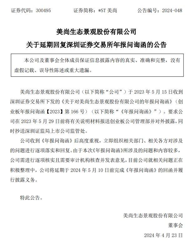 公告显示,公司2023年5月15日即已收到深交所《关于对美尚生态景观股份有限公司的年报问询函》(创业板年报问询函【2023】第166号),要求公司在2023年5月29日前将有关说明材料报送创业板公司管理部并对外披露,同时抄送深圳证监局上市公司监管处。