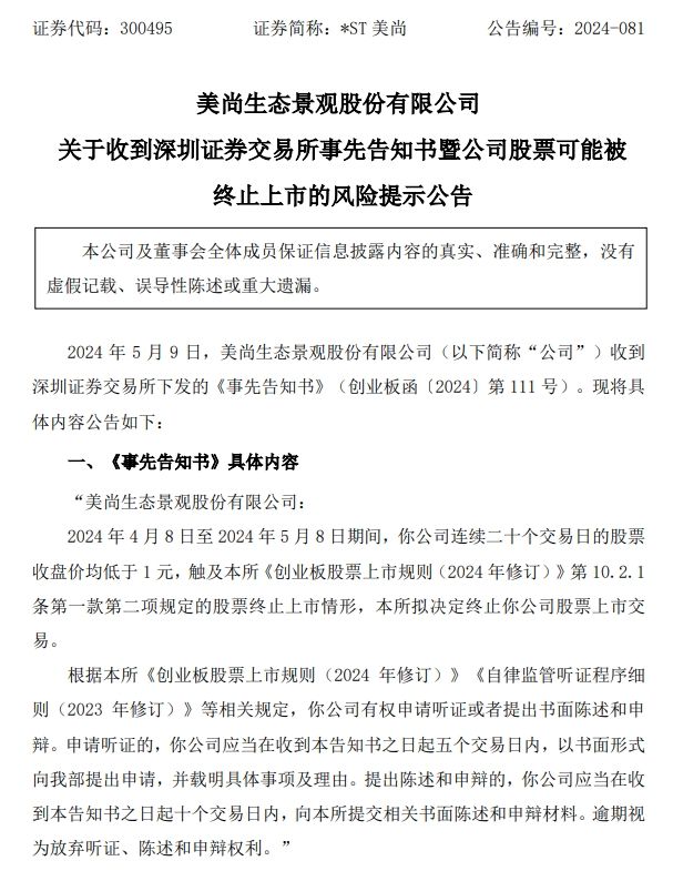 美尚生态成立于2001年,是生态景观建设A股上市企业。公司公告显示,4月8日至5月8日期间,*ST美尚连续二十个交易日的股票收盘价均低于1元。深交所拟终止该公司股票上市交易。